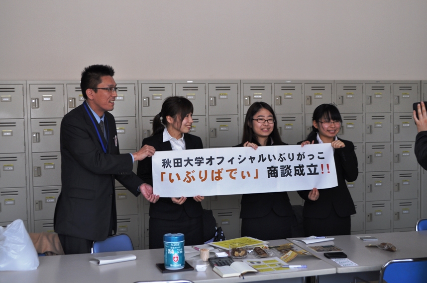 この日はグランマート手形店に伺い,2月4日?5日の樽開けの際に作製したサンプルを持参して,タカヤナギのバイヤーに対して製品のプレゼンテーションを行い,取引価格や数量などについて交渉しました。学生たちは,資料の他に手作りのフリップや製品しおり,試食用のいぶりがっこを準備し,今年の「いぶりばでぃ」をPRしました。バイヤーの方からは「食感もよく,燻煙の香りもいい」とコメントをいただきました。具体的な条件の提示では,納品できる最大の数量や配送先,商品ディスプレイの希望などについてやりとりし,学生たちは一生懸命それに答えていました。
